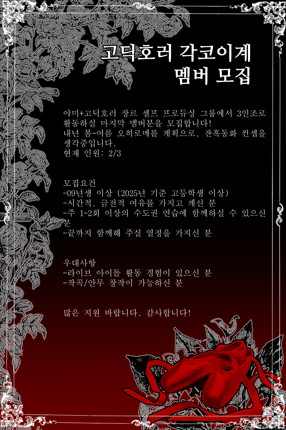 야미+고딕호러+각코이 장르의 셀프 프로듀싱 그룹을 함께 꾸려나가실 마지막 멤버분을 모집합니다! 자세한 사항은 아래 이미지를 참조해주시면 감사하겠습니다!