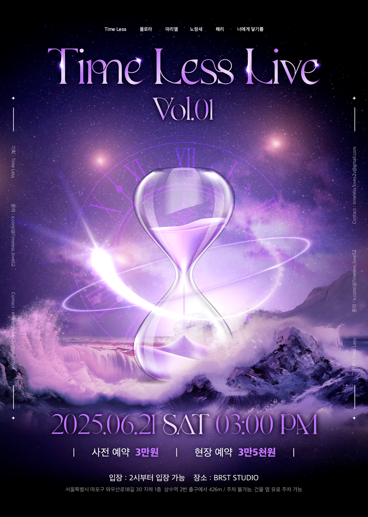 이벤트 정보 공연명: Time Less Live Vol.01 일시: 2025년 6월 21일 (토) 오후 3시 공연 시작 입장: 오후 2시부터 / 오후 3시까지 입장 완료 장소: BRST STUDIO 주소: 서울특별시 마포구 와우산로18길 30, 지하 1층 (상수역 2번 출구에서 426m) 출연: Time Less / 플로라 / 노랑새 / 마리앨 / 페리 / 너에게 닿기를 기획: Time Less 입장 제한: 최소 50명, 최대 130명 수용 가능 현장 주차 불가. 건물 옆 유료 주차장 이용 가능.  ̄ ̄ ̄ ̄ ̄ ̄ ̄ ̄ ̄ ̄ ̄ ̄ ̄ ̄ ̄ ̄ ̄ ̄ ̄ ̄ ̄ ̄ ̄ ̄ ̄ ̄ ̄ ̄ ̄ ̄ 유의사항 3시 이후 입장은 노쇼로 간주됩니다. 노쇼 시 현장 예약금을 지불하셔야 입장이 가능합니다. 지각하지 않도록 주의 부탁드립니다. 공연장 줄 대기 : 1시 30분부터 가능합니다.그 전에 먼저 대기하지 말아주세요. 출연진 및 스탭들이 원활하게 움직이기 위해서입니다. 양해부탁드려요. 짐 보관 시 : 물품을 따로 보관할 장소가 없습니다. 너무 무거운 짐이라 공연 관람에 불편을 줄 경우 스태프에게 먼저 문의해주세요. 카운터에 맡기셔도 스태프의 판단에 따라 거절될 수 있습니다. 분실 시 책임지지 않습니다. 당일 입장시 닉네임과 핸드폰 뒷자리 번호가 일치하지 않으면 입장이 불가능 할 수 있습니다. 사전 예약 티켓은 최대 130명 한정으로 조기 마감될 수 있습니다. 취소는 지정된 취소 기간 내에만 가능하며, 이후 환불 불가합니다. 양도 기간 이후 티켓 양도는 불가하며, 정가 외 가격으로 양도 시 예약이 취소될 수 있습니다. 현장 결제는 현금 또는 계좌이체만 가능하니 미리 준비해 주세요. 공연장 내 주차가 불가하오니 대중교통 이용을 권장합니다. 사진 촬영 후 업로드 시 타임레스 측 사전 문의 필수. 미준수 시 법적 책임이 발생할 수 있습니다. 공연 후기 및 사진은 #타임레스라이브 #TimelessLive 해시태그와 함께 공유 부탁드립니다!  ̄ ̄ ̄ ̄ ̄ ̄ ̄ ̄ ̄ ̄ ̄ ̄ ̄ ̄ ̄ ̄ ̄ ̄ ̄ ̄ ̄ ̄ ̄ ̄ ̄ ̄ ̄ ̄ ̄ ̄ 티켓정보 티켓 오픈: 2025년 5월 1일 PM 12:00 티켓 마감: 2025년 5월 15일 PM 11:00 사전 예약: 30,000원 (입장료 + 입장 특전 포함) 현장 예약: 35,000원 (입장료만, 특전 미포함)  ̄ ̄ ̄ ̄ ̄ ̄ ̄ ̄ ̄ ̄ ̄ ̄ ̄ ̄ ̄ ̄ ̄ ̄ ̄ ̄ ̄ ̄ ̄ ̄ ̄ ̄ ̄ ̄ ̄ ̄ 예약 및 취소/양도 정책 취소 기간: 2025년 5월 16일 ~ 5월 23일 양도 기간: 2025년 5월 24일 ~ 5월 31일 양도 조건: 티켓은 정가(30,000원)로만 양도 가능. 양도 절차: 타임레스 메일(timeless.loves2v@gmail.com)로 아래 정보 작성 후 송부 예약자: 이름, 연락처 양도자: 이름, 연락처 참고: 양도 기간 이후 사전 예약 불가, 현장 예약만 가능.  ̄ ̄ ̄ ̄ ̄ ̄ ̄ ̄ ̄ ̄ ̄ ̄ ̄ ̄ ̄ ̄ ̄ ̄ ̄ ̄ ̄ ̄ ̄ ̄ ̄ ̄ ̄ ̄ ̄ ̄ 결제 안내 사전 예약 : 계좌이체만 가능 (카드 결제 불가) 현장 결제 : 현금 또는 계좌이체만 가능 (카드 결제 불가) 주차 안내 주차 : 현장 주차 불가. 건물 옆 유료 주차장 이용 가능. 주차 관련 내용 : https://cafe.naver.com/timelessloves2/562  ̄ ̄ ̄ ̄ ̄ ̄ ̄ ̄ ̄ ̄ ̄ ̄ ̄ ̄ ̄ ̄ ̄ ̄ ̄ ̄ ̄ ̄ ̄ ̄ ̄ ̄ ̄ ̄ ̄ ̄ 사진 촬영 및 공유 안내 공연 후기 및 사진 공유 시 아래 해시태그를 사용해 주세요 #타임레스라이브 #TimelessLive 중요: 사진, 영상 촬영 후 SNS 또는 기타 플랫폼에 업로드 시, 반드시 타임레스 측 (X:@Timeless_loveS2 또는 Email: timeless.loves2v@gmail.com)으로 사전 문의 후 업로드해 주세요. 촬영만 하는건 OK, 업로드에만 꼭 연락주세요! 삼각대 등으로 촬영 하시는 분이 계신다면 따로 연락 주세요. 촬영 스태프 명찰을 따로 지급해드립니다. 가실 때 꼭 반납하고 가세요.  ̄ ̄ ̄ ̄ ̄ ̄ ̄ ̄ ̄ ̄ ̄ ̄ ̄ ̄ ̄ ̄ ̄ ̄ ̄ ̄ ̄ ̄ ̄ ̄ ̄ ̄ ̄ ̄ ̄ ̄ 문의 X: @Timeless_loveS2 Email: timeless.loves2v@gmail.com  ̄ ̄ ̄ ̄ ̄ ̄ ̄ ̄ ̄ ̄ ̄ ̄ ̄ ̄ ̄ ̄ ̄ ̄ ̄ ̄ ̄ ̄ ̄ ̄ ̄ ̄ ̄ ̄ ̄ ̄